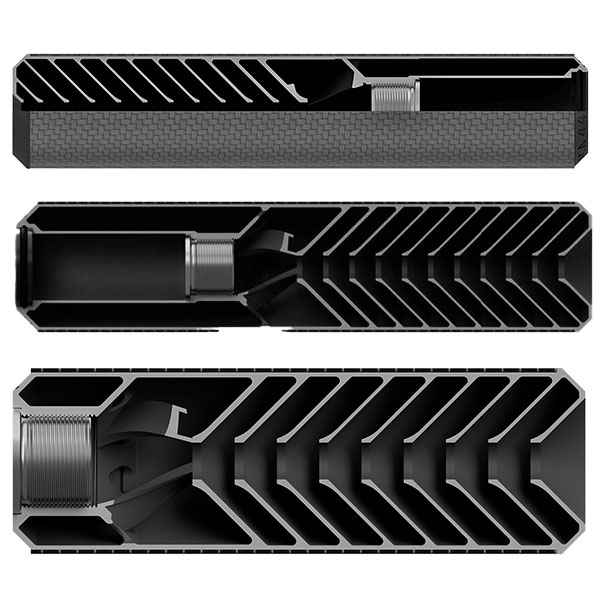 Sugárhajtómű mérnökök által tervezett belső áramlástechnológia. Egyedileg gyártva Grade 5-ös, Ti64-es titánból (egy alfa-béta titánötvözet, nagy fajlagos szilárdsággal és kiváló korrózióállósággal. Olyan területeken alkalmazzák széles körben, ahol az alacsony sűrűség és a kiváló korrózióállóság szükséges). Karbantartás mentes kivitel, korlátlan élettartam a titán belsőnek köszönhetően. Ellennyomaték rendszerrel rendelkezik, úgy van megtervezve a belső áramlástechnológia, hogy a lövések ellennyomatékot képeznek a puska menetére, így minden lövés a lecsavarodás ellen dolgozik (nem kell ragasztani a közbetéteket) Egyedüli anyagfrekvencia tervezés, monolit test a karbon vázzal a lövéskor keletkező anyagrezgések tervezett módon kioltják egymást és nem lép fel az átlagos hangtompítóknál tapasztalható éles frekvenciájú hanghatás (teljesen más hangélmény) csőkorona védelem a visszaégés ellen a direkt menetes kiviteleknél 25%-kal nagyobb nyomáson dolgozik a monolit titán váznak köszönhetően így nem marad benne lerakódás. Lőmozikba is ajánlott a limit nélküli lövésszámnak köszönhetően. Öntöltő, illetve hadi puskákhoz is használható