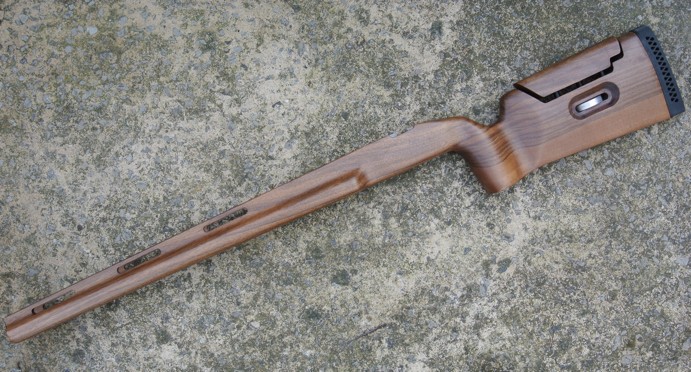 A Victrix körülbelül három kilót nyom, így a súlyunk egyre nő, de a Victrix ezt ellensúlyozza a gyönyörű diófa alappal, ami négy kiló alatt van, és még egy állítható pofadarabot is tartalmaz! Az alumínium oszlopokkal és Devcon-típusú fém-epoxival történő befúvás és ágyazás megfelelően megtörtént, és a fegyvercső természetesen nagyvonalúan szabadon úszik a szellőzős elülső végén.